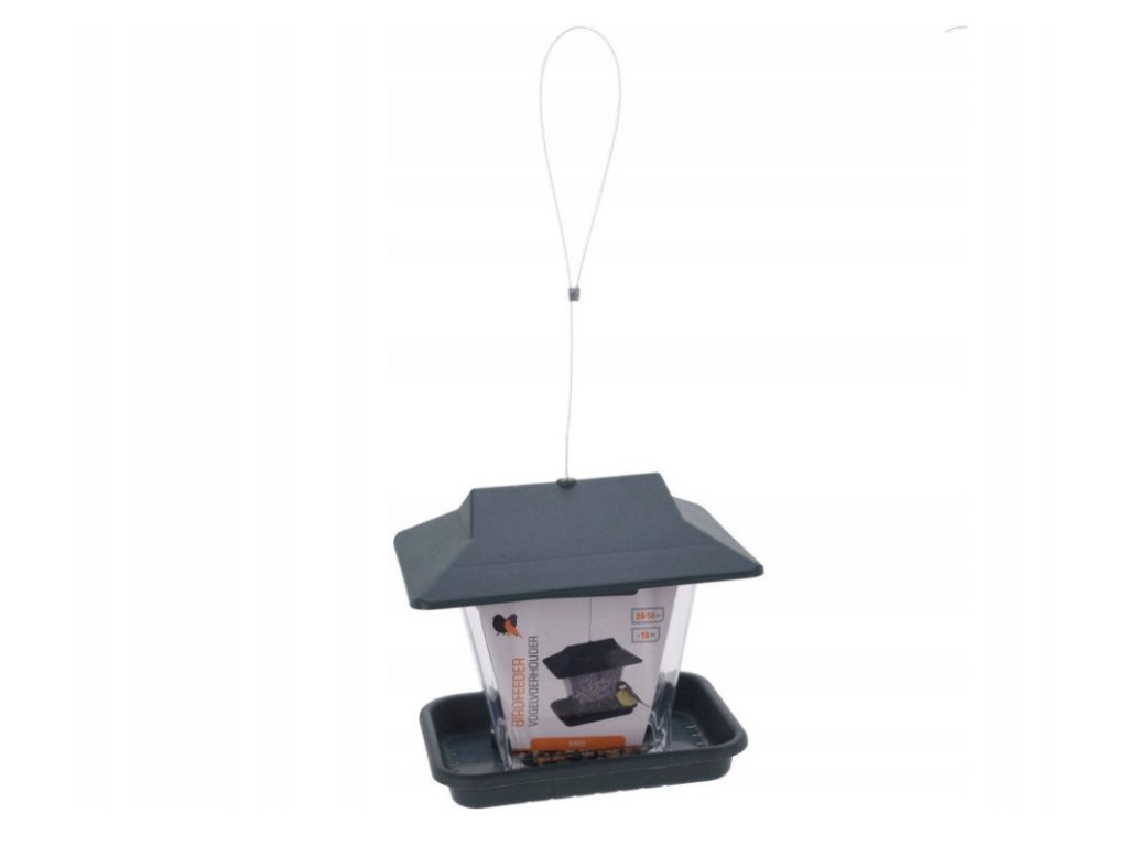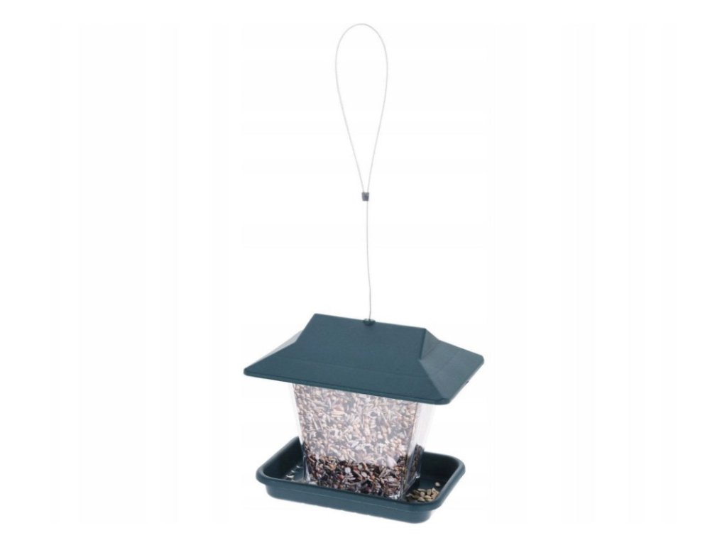 Praktická konstrukce: stříška chrání před srážkami, přístup k zásobníku na zrno je jednoduchý a pohodlný.