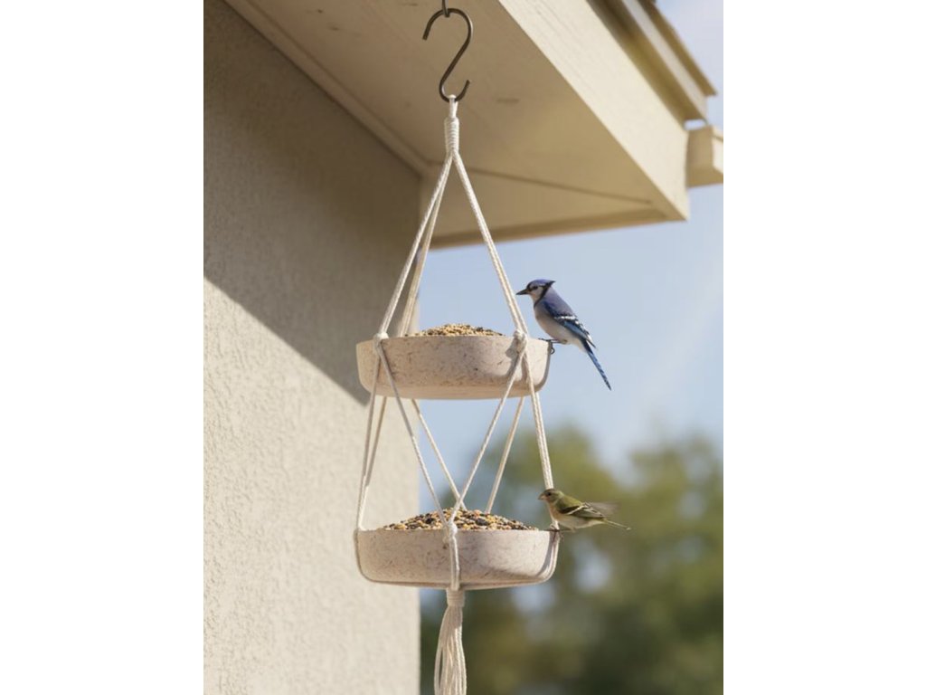 Závěsná dekorace z přírodních materiálů je vhodná na balkon i do zahrady a zároveň slouží jako praktické dvoupatrové krmítko. Kombinace bambusu a juty v jemné béžové barvě působí lehce a přirozeně, díky dvoupatrovému provedení nabízí možnost krmítka i pítka v jednom. Snadno se zavěsí a vytvoří příjemné místo pro venkovní ptactvo.