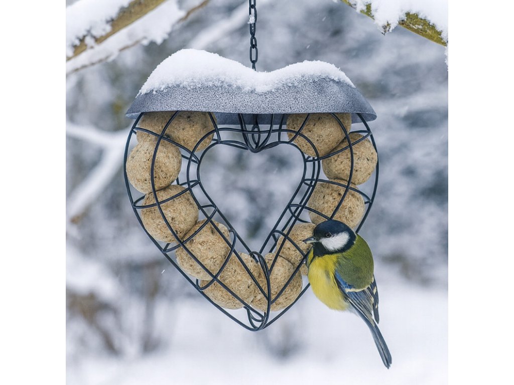 Výjimečný tvar srdce – vyniká na pozadí klasických krmítek a dodává okolí kouzlo.