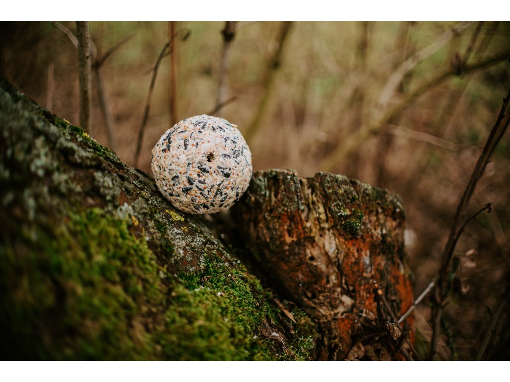 Ručně vyráběná maxi koule s dírou, obohacená o sušené moučné červy – přirozený zdroj bílkovin. Díra umožňuje zavěšení do Lovy krmítka na maxi koule nebo vlastní dotvoření. Bez sítěk a plastů, ohleduplná k přírodě, ideální pro ptactvo vyžadující extra výživu a energii.