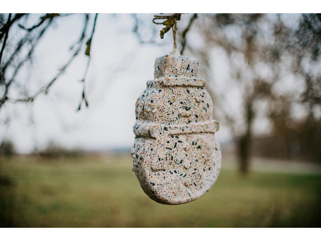 Ručně vyráběný sněhulák s kousky vlašských ořechů – zdrojem zdravých tuků a energie. Bez sítěk a plastů, ohleduplný k přírodě, ideální pro ptactvo v zimě a jako chutný zdroj energie.